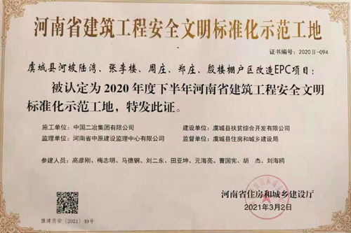 4月1日, 中國二冶鋼構分公司承建的虞城棚改項目被河南省住房和城鄉建設廳評為 2020年下半年“省級建筑施工安全標準化示范工地”稱號 ,這是該項目部成立以來繼獲得商丘市“安全標準化示范工地”稱號后獲得的又一榮譽,實現了該公司在中原地區省級安全文明施工獎項方面零的突破。