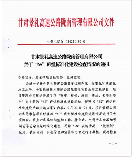 為進一步提升景禮高速公路各單位規(guī)范化、標(biāo)準(zhǔn)化和精細化施工水平,全面推進景禮高速公路隴南段項目品質(zhì)工程建設(shè),春節(jié)過后,隴南段項目管理公司組織開展了以“整理、整頓、清掃、清潔、素養(yǎng)、安全”為主題的“6S”班組標(biāo)準(zhǔn)化建設(shè)活動,按照《“6S”班組標(biāo)準(zhǔn)化建設(shè)活動實施方案》內(nèi)容。
