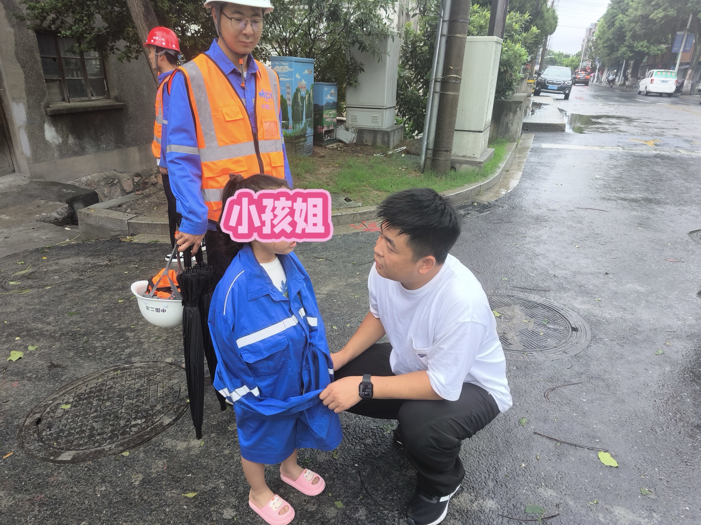 9月16日上午8時(shí),項(xiàng)目部正對(duì)項(xiàng)目在建房屋進(jìn)行防臺(tái)風(fēng)檢查,一個(gè)小女孩在風(fēng)雨中無助地徘徊,顯然是與家人走散了。面對(duì)突如其來的狀況,項(xiàng)目部的幾位青年員工立即行動(dòng)起來,他們迅速上前,將小女孩帶至安全地帶。