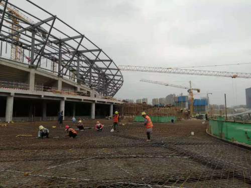 目前,項目配套用房B、C區已經全部封頂,B區二次結構完成90%,C區二次結構完成70%。配套用房D1-4區主體完工,D5區屋面層鋼筋完成30%,D6區四層鋼筋綁扎完成70%,D7區屋面層支模架完成90%,D8區屋面層鋼筋完成5%,D9區屋面鋼筋完成10%,其中D1-6區二次結構共完成70%,抹灰工程共完成10%。全民健身館J1-J6區土建混凝土量僅剩余150立方即可全面交予鋼結構工程,鋼結構工程現已完成80%,全民健身館二次結構完成70%。