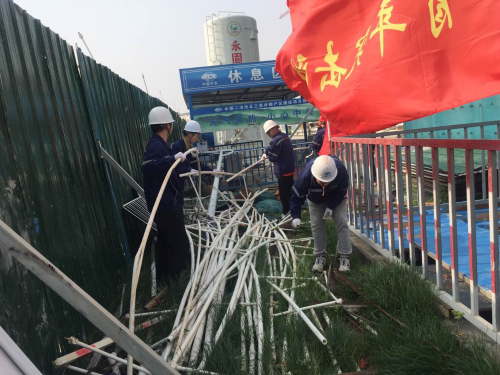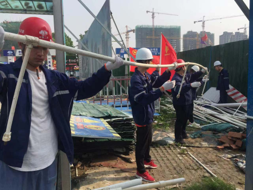 在義務勞動活動中,團旗和青年突擊隊旗在工地迎風飄揚,項目部團員青年們利用手推車、三輪車對施工現場的廢棄鋼筋、土方布、鋼管,pvc水管等施工材料進行了統一清理和歸類堆放,在搬運施工材料的過程中,大家采取接力的形式將一車車施工材料堆放整齊,將廢棄物清理干凈,雖然大家干的汗流浹背,但始終歡聲笑語、干勁十足,沒有絲毫的停歇。