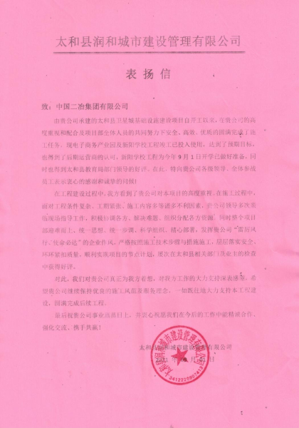 信中太和縣潤和城市建設管理有限公司對中國二冶在各方面的工作支持深表感謝,希望中國二冶繼續保持優良的施工風范及服務理念,一如既往地大力支持該工程建設,圓滿完成后續工程。并表示愿與中國二冶集團有限公司在今后的工作中能精誠合作,共鑄輝煌!