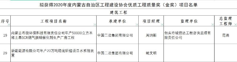 近日,內蒙古自治區工程建設協會公布優質工程質量獎獲獎名單,中國二冶城建分公司內蒙古希捷環保科技有限責任公司年產50000立方米稀土基SCR煙氣脫硝催化劑生產廠房工程、新能能源有限公司年產20萬噸穩定輕烴項目水系統裝置等兩個項目榜上有名。
